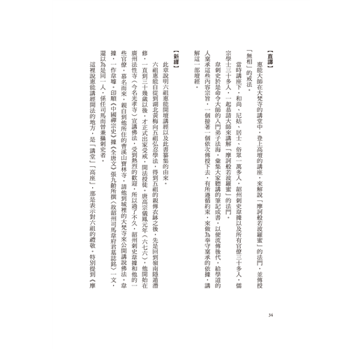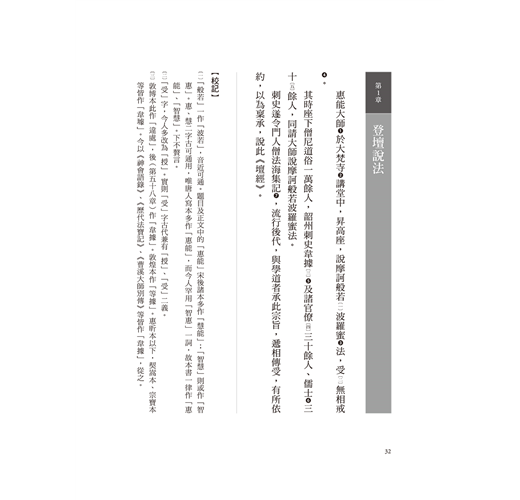 本書從禪宗的創始傳說說起,介紹《六祖壇經》的傳本,以及六祖惠能的生平行誼、學佛求法和宣講《壇經》的經過。並按內容將全書重新分為六十章,分章分段,順乎文氣,合乎文理,校注詮譯,解析詳盡,論辨分明,常能從文學的角度由《壇經》而佛典,由小故事說明大道理,因而使讀者不覺得枯燥,而興味盎然,可說是了解佛法的重要參考書。