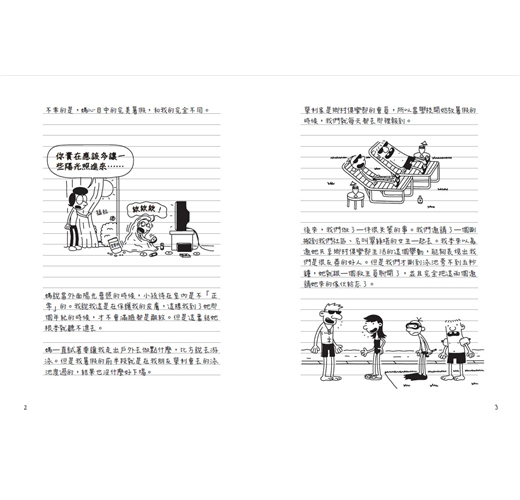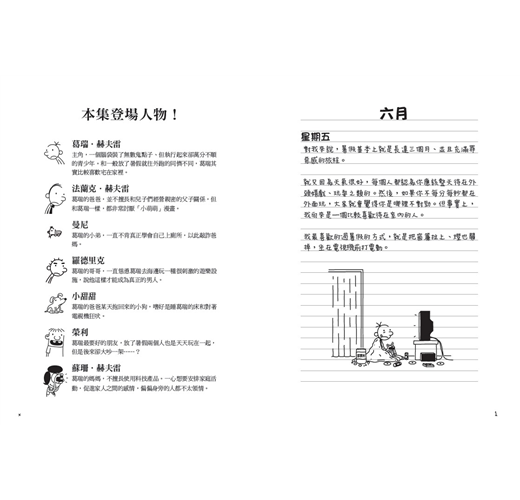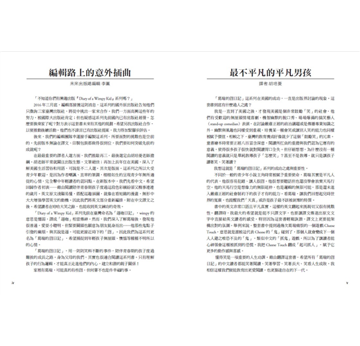 在最最重要的譯者人選方面,我們推敲再三,最後選定由胡培菱老師擔綱。胡老師平常就關注出版生態,文筆絕佳;再加上長年住在美國,深入了解美國生活習俗和用語,可說是不二人選。其次是版面。這系列之所以大受青少年歡迎,是因為作者嘲諷、直率的筆調,栩栩如生的呈現青少年無所適從的心情,完全擊中年輕讀者的認同點。在新版本中,我們先看中文,希望回歸作者初衷──藉由閱讀陪伴青春期孩子度過這段色彩繽紛卻又糗事連連的歲月。英文原文淺顯易懂,搭配逗趣插圖,就像在看短篇的漫畫,無形中大大增強學習英文的動機。因此我們將英文部分重新編排,附在中文譯文之後。希望讀者在哈哈大笑之餘,也能收到英文練功的奇效。