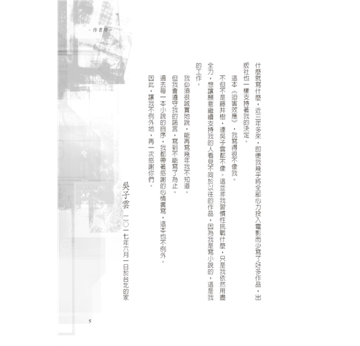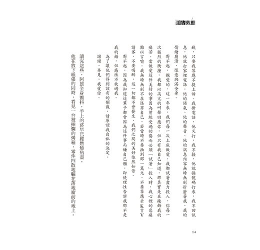 阿雄腦子裡想著的是一切生變前的情景,他想起他拿起那兩張A4紙,關上冰箱門,走到客廳打開小檯燈,從口袋裡拿出香菸,點上火,深深地吸一口,彷彿在為讀這張紙的內容之前做心理準備。這不是他故意的,而是他長久以來養成的習慣。因為他生意上的應酬機會不少,王素媛雖然不反對,但也多次抱怨兩人說話和相處的時間不夠,他陪伴酒精和朋友的時間總是比陪伴她要多許多,他們為了這樣的事情吵過好幾次架,但狀況不見改善。王素媛不想再因為這樣的事情和阿雄起爭執傷感情,開始在阿雄回家之前,把想說的話用電腦打上,然後列印,阿雄讀過之後就會在背面寫上回應,這方法看似有種無形的距離感,但對他們來說卻是一種期待、一種希望,因為那上面的話不會是冰冷鋒利的傷人言語,而是溫暖的問候和話家常。