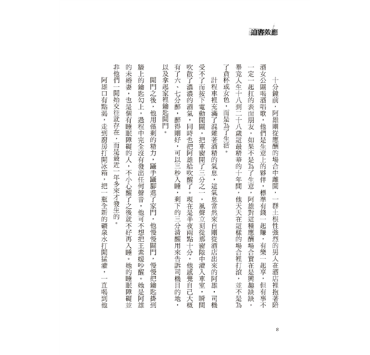十分鐘前,阿雄剛從應酬的場合中離開,一群土根性強烈的男人在酒店裡抱著陪酒女公關喝酒唱歌,他們是生意上的夥伴,標準有錢一起賺,有樂一起享,但有事不一定一起扛的表面朋友,如果不是為了生意,阿雄對這種應酬場合實在是興趣缺缺,畢竟人生十八到二十八歲這最精華的十年間,他天天在這樣的場合裡打滾,並不是為了貪杯或女色,而是為了生活。