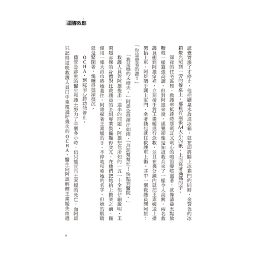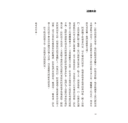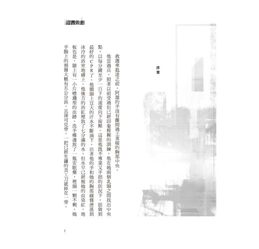 他當過兵,照著以前受過但已經印象模糊的訓練,他在她兩個乳頭之間找出中央點,以每分鐘至少一百下的速度向下按壓,這是他既不專業又手拙的狀況下,能做到最好的CPR了。他額頭上豆大的汗水不斷滴下,沿著他的手和她的胸部線條滑落到冰冷的浴室地磚上。他後方的浴缸裡放了七分滿的水,但水早已經被她的血染紅,地板也是,牆上有一小片噴濺型的血跡。洗手檯邊放了一瓶安眠藥,裡頭一顆不剩。她手腕上的割傷大概有五公分長,且深可見骨,一把已經生鏽的美工刀就掉在一旁。