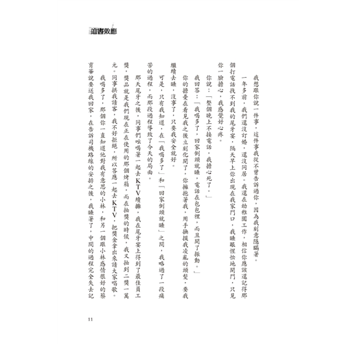 對不起,親愛的,這一年來,我們每一次上床做愛,我都試著盡力投入,你每一次猛烈的衝撞,我都以高亢的叫聲回應你,但只有我自己知道,那其實是在掩飾我的痛苦。當做愛這件美好的事因為曾經受過的傷而必須「試著」投入時,我心裡的悲痛難以言喻。我無時無刻不在怪罪自己,若當時不要抽到那一萬元,不要答應去KTV請客,不要喝醉,這一切都不會發生,我們之間的美好依然如昔。