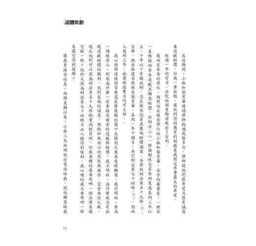 我心裡那道被侵害後還在修復期的傷口在聽判之後再度被撕裂,我不明白,身為一個被害人,到底為什麼一定要接受被告的道歉與賠償,我不明白,為什麼我沒有拒絕道歉賠償的權利,他們表現的誠意,相較於我內心的煎熬與痛苦,完全無法比擬,現在他們可以因為刑法第五十九條酌量減輕其刑,但我身體的傷要用哪一條法律來讓它輕一點?他們因為刑法第七十四條不必入獄得到緩刑,我心裡的痛又要用哪一條來讓它得到緩解?