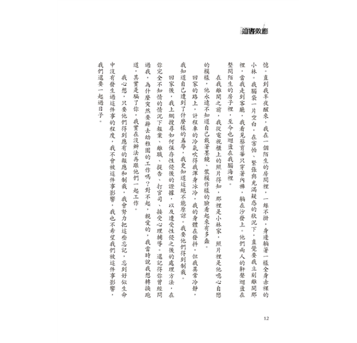 回家後,我上網搜尋如何保存性侵後的證據,以及遭受性侵之後的處理方法,在你完全不知情的情況下報案、離職、提告、打官司、接受心理輔導。還記得你曾經問過我,為什麼突然要辭去幼稚園的工作嗎?對不起,親愛的,我當時說我想轉換跑道,其實是騙了你,我實在沒辦法再跟他們一起工作。