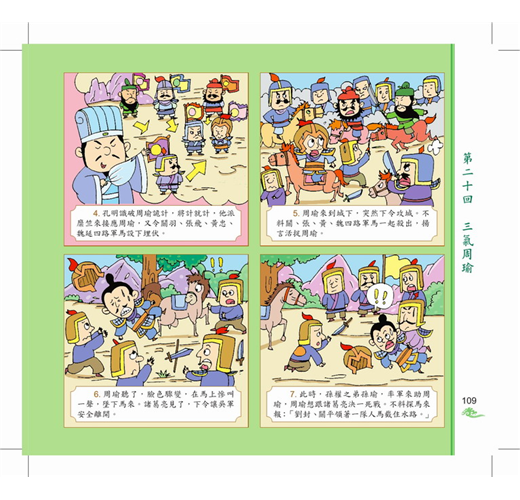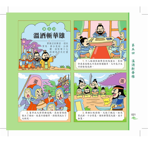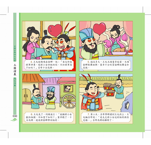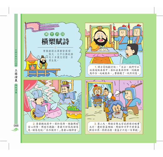 《三國演義》描寫東漢末年到西晉初年之間近105年的歷史,以描寫戰爭為主,反映東漢末年的群雄割據混戰及魏、蜀、吳三國之間的政治和軍事鬥爭,同時也塑造了一批叱吒風雲的英雄人物,如諸葛亮即是「賢相」的化身,具有「鞠躬盡瘁,死而後已」的高風亮節;劉備被塑造成勤政愛民、禮賢下士、知人善任的仁君典型。本書還描寫了大大小小的戰爭場景,構思宏偉,手法多樣,讓我們身臨其境般的目擊一場場刀光血影的戰爭,見證歷史的風雲。