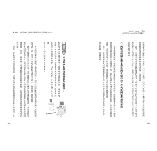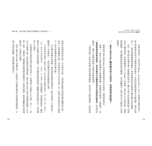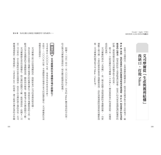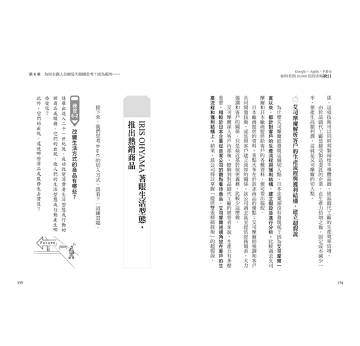 他發現世界知名的企業家,能夠開創嶄新的經營模式,使公司超越同業成為領先者,是因為在面對經營的課題與挑戰時,他們不是仰賴一般常用的分析架構,而是從反覆嘗試中發現新的觀點,採取「至今沒人想過、網路上也找不到」的對策。例如: