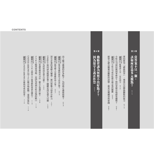 本書不會介紹新的知識或分析架構,而是舉出許多優秀經營者的案例,介紹他們如何自由地變換角度、發想新創意,並出題讓各位練習。簡單來說,本書是幫助各位培養直覺力的商務版禪修問答。希望各位可以實際練習,訓練自己改變看待事物的觀點。
