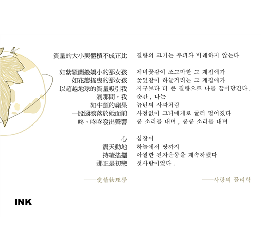 畢業於台灣大學中文系,目前在總統府擔任中文與韓語導覽志工。熱愛文學、藝術、音樂、攝影。過去翻譯作品主要以童書為主,有科普漫畫《海洋》,長篇童話《夢想學校》、橋梁書《生命多美好》、繪本《米飯真好》等數十本。《愛情物理學》為第一本翻譯詩集。