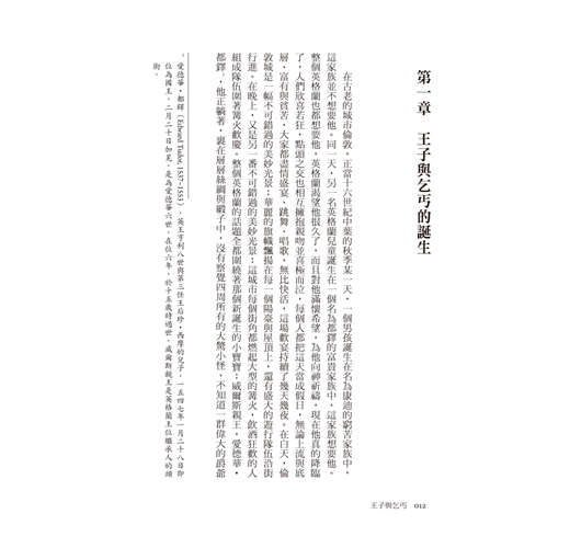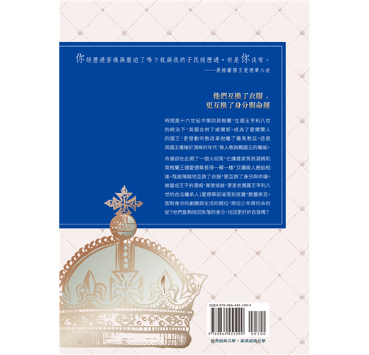 命運卻在此開了一個大玩笑,它讓貧家男孩湯姆和英格蘭王儲愛德華長得一模一樣,又讓兩人邂逅相逢、陰差陽錯地互換了衣服,更互換了身分與命運。被當成王子的湯姆,尊榮煊赫,更是老邁國王亨利八世的合法繼承人;愛德華卻淪落到底層,飽嘗疾苦。面對身分的劇變與生活的錯位,兩位少年將何去何從?他們能夠找回失落的身分,找回更好的自我嗎?