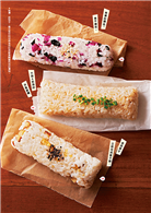 其三、家庭派對點心:種類豐盛的棒狀飯糰。使用生魚片或生火腿等豐富的食材製作,可成為宴請客人的美味點心。切成3~4等分的話,可搖身一變成為像手鞠壽司那般一口大小的飯糰。口味挑剔的客人對於這樣的點心也會讚不絕口吧!