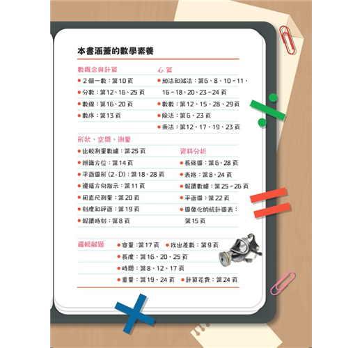 在本書的生活情境中處處有數學,其涵蓋的數學概念有「數概念與計算」、「形狀、空間、測量」、「資料分析」、「邏輯解題」、「心算」等面向。讓孩子在閱讀中,練習活用自己的數學技能來解決各類數學問題,並在有趣的解題與互動活動中,提升自己的學習興趣和數學素養。