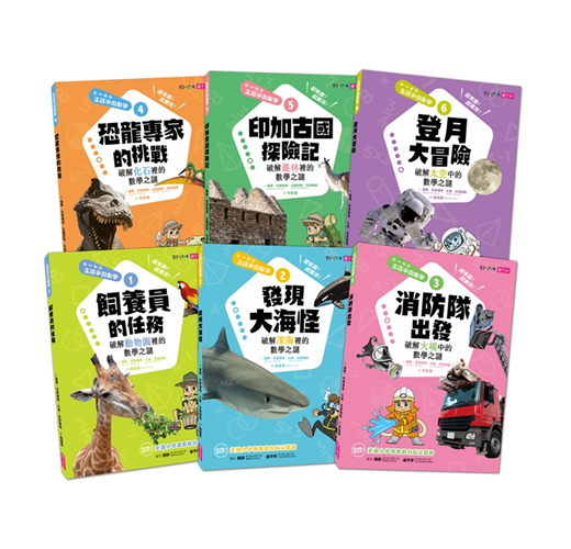 可親子天下這一套六本的《生活中的數學套書》,談及的都是孩子最愛的類別:《飼養員的任務》、《發現大海怪》、《消防隊出發》、《恐龍專家的挑戰》、《印加古國探險記》、《登月大冒險》。這六本中有孩子愛的恐龍考古主題、冒險奇幻之旅,還有職業生涯探索,在跨領域中探索,探索中自然而然需要精準數學語言來解決問題、發展能力。