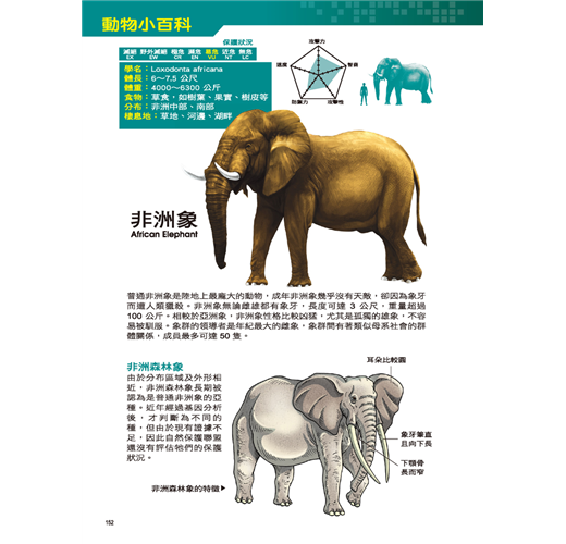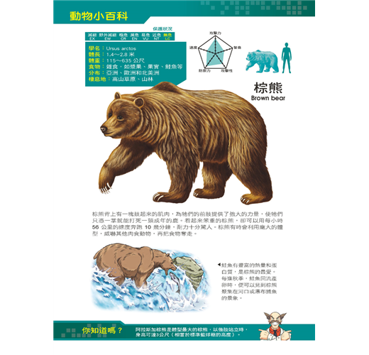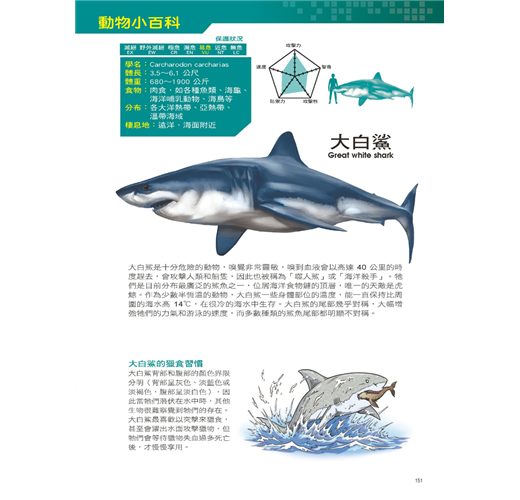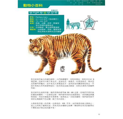 設有「動物小百科」單元,特別介紹貓科動物、熊科動物、靈長目動物、硬骨魚和軟骨魚、象科動物、犀科動物的構造與小常識,以及獅子、老虎、猩猩、棕熊、大白鯊、旗魚、大象、犀牛等動物的超炫常識,讓小朋友有系統的學習。
