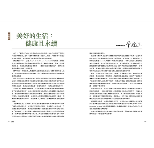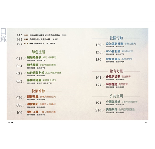 《台灣好生活》這本書,基本上是沿著這樣的理路而架構起來的。首篇「綠色生活」談住宅、談交通乃至生活中的科技,從個體的生活面出發,介紹諸多國內外的經驗,無非在於邀請讀者一同走進追尋LOHAS的行列。第二篇「美好晚年」,進一步關注個體必將面對的老化課題——老化是個人的境遇,但養老卻是群體的問題。除了個人努力保持健康以活躍老年之外,政府的退休制度、長照制度、甚至社區的組織、非營利團體是否蓬勃也都影響個體能否獲得靜好晚年。