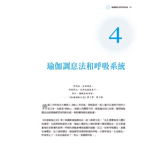 艾揚格大師按照古老的印度哲學教導人們,生命不僅是「來自塵土,歸於塵土」的過程,更是「從氣到氣」的過程,而人們從中獲得了力量。本書結合現代解剖學及古典瑜伽文獻,詳盡說明瑜伽調息法的理論、藝術及功效,解釋14種瑜伽調息法的練習方式,搭配近200張圖片示範進行調息法時的姿勢正誤,並設計由簡入繁的循序漸進學習課程,也特別指出練習過程中可能遇到的困難,以及應規避的風險,期望盡可能地以書面語言,指導有志於學習瑜伽調息藝術的人們。