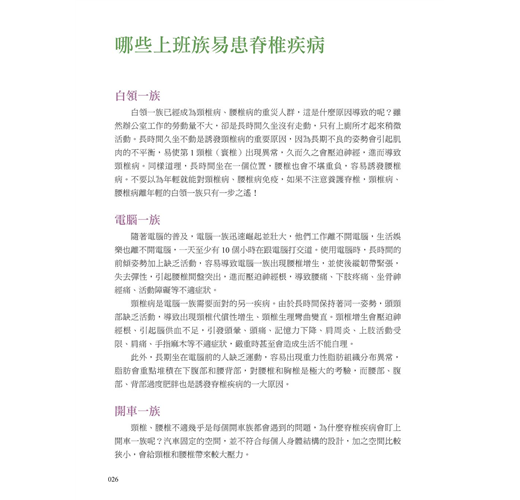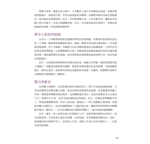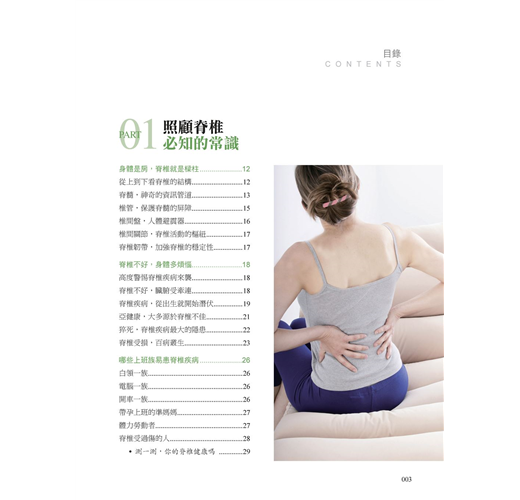 在編寫本書的過程中,我們查閱大量資料、訪問眾多專家學者,旨在盡力避開晦澀深奧的專業知識,盡可能多地提供切實可行的具體措施,使本書更注重知識性、實用性和指導性。此外,書中還配有眾多精美圖片,讓讀者在輕鬆閱讀的同時,收穫更多脊椎養護的健康知識。