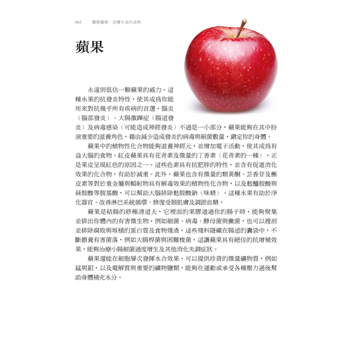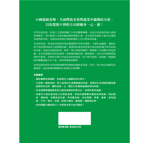 本書深入介紹能改變生命的五十種食物,揭露每一種食物都有一套特別的療癒特性,並讓我們知道它們如何在讓身體恢復與療癒的同時,兼顧情感上的慰藉與靈性上的充實。