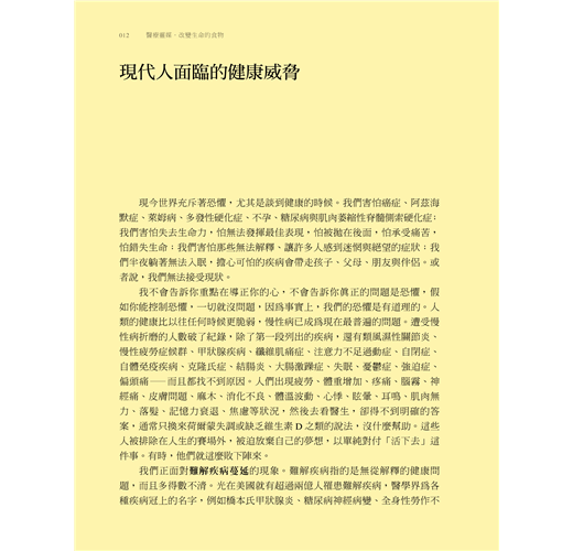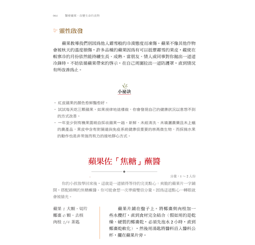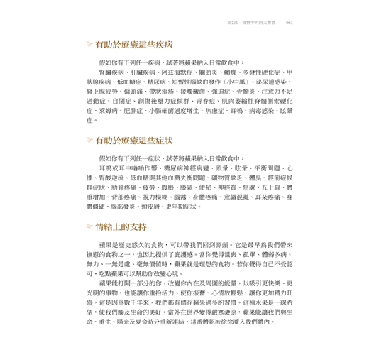 一旦察覺了健康與食物的緊密關係,就好像得到了通關密碼,可以通往屬於你個人的健康之道。到那時候,讀者就不會因為書中介紹的是溫帶地區作物,不全然是熟悉的亞熱帶蔬果而感到隔閡。飲食是很個人化的事,健康卻有一定的原則可循,一旦重新找回自己的生物直覺,就如同隨時有「高靈」在身邊指導。這項特異功能在食安問題頻傳的現在,猶如安身立命的護身符,能讓你我常保安康。