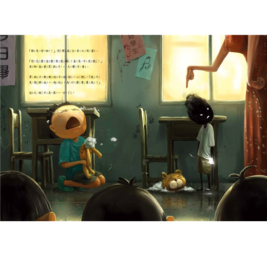 「《黑孩子》是一本用圖畫給予人們希望的繪本,作者運用了現實中的故事,結合圖像,給予「黑孩子」祝福。」