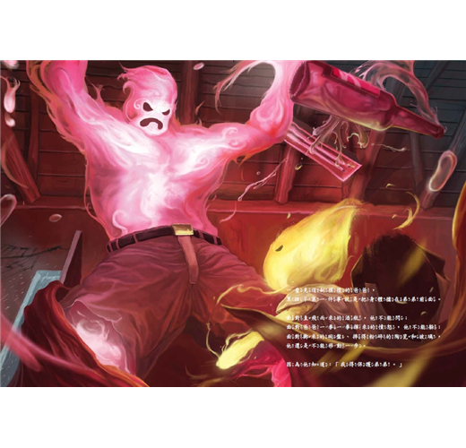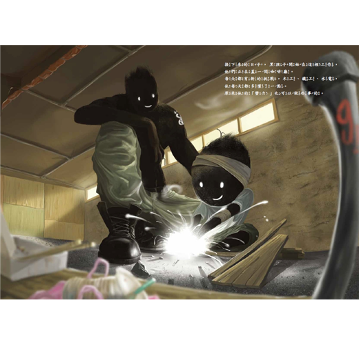 白天的黑孩子,在學校裡是被扣水桶、遭同學恥笑圍攻的對象。黑孩子哥哥以拳頭保護自己與弟妹,日復一日將自己武裝起來。晚上的光景,則是穿過米酒瓶的透視,看到蜷縮在床上的黑孩子;而父親像一團狂怒烈火,席捲稚弱的孩子;哥哥總是擋在弟弟面前,去承受那酒醉大人的拳來腳去。繪者的寫實手法,震撼人心。