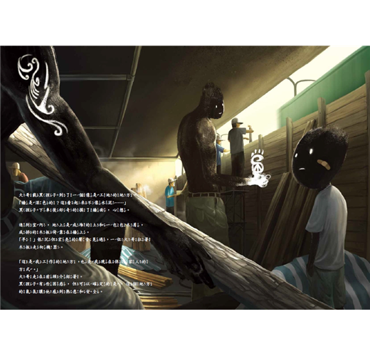 由年輕視覺工作者陳怡揚繪圖的《黑孩子》,是臺灣少見的取材自社會問題和現象的繪本。它不像多數繪本的快樂甜美、可愛溫馨;大面積的深色調,迫使閱讀者直視幽暗角落的孩子。有點Q版的人物,置入寫實背景中;或是鐵皮屋頂傾杞小屋,或是屋瓦補丁的土角厝,或是紅標米酒瓶橫陳的室內,販售檳榔的殘敗店頭……。