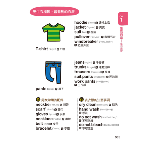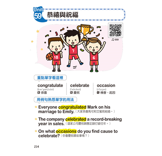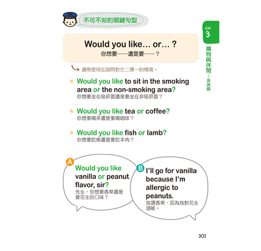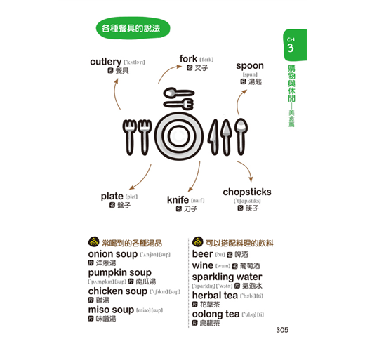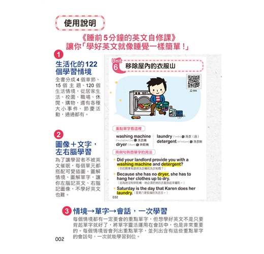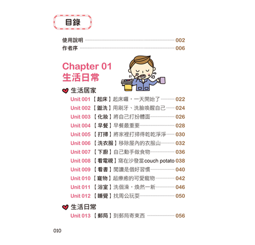 全書分成4個章節、15個主題、122個生活情境,從居家生活、校園、職場、休閒、購物,還有各種大小事件、節慶活動,通通都有。