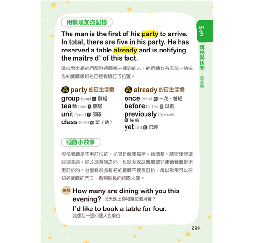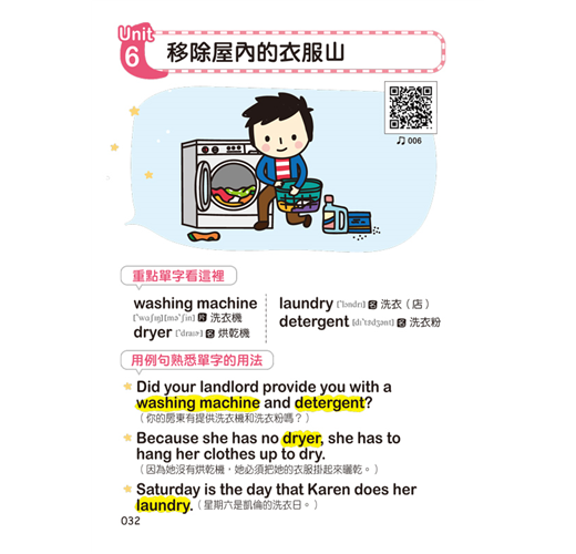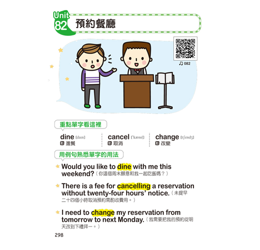 每個情境都有一定要會的重點單字,但想學好英文不是只要背起單字就好了,將單字靈活運用在會話中,也是非常重要的。每個情境皆會列出重點單字,並列出含有這些重點單字的會話句,一次就能學習到位。