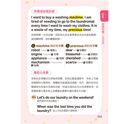 作者從日常生活中發想,每個情境皆撰寫30字以內的英語短文,並從文中補充關鍵單字與衍生字彙,往上提升英語力!