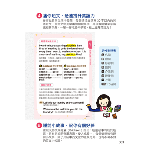 催眠大師艾瑞克森(Erickson)指出「睡前故事有助於睡眠,更有助於開發潛意識、使人成長。」每個情境皆有睡前小故事,除了介紹中西文化的差異之外,也有不可不知的英文小知識。