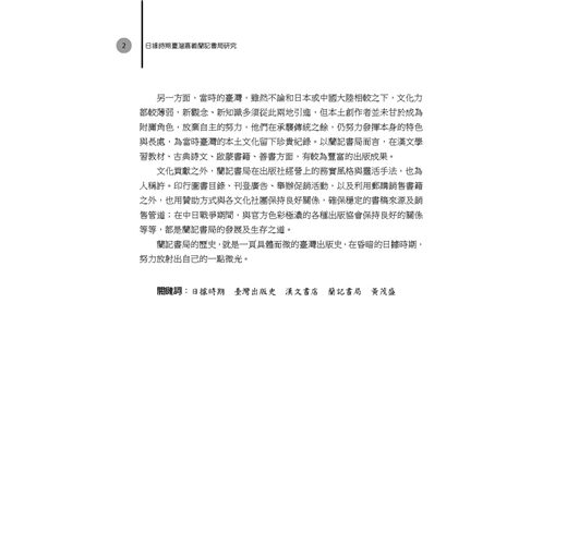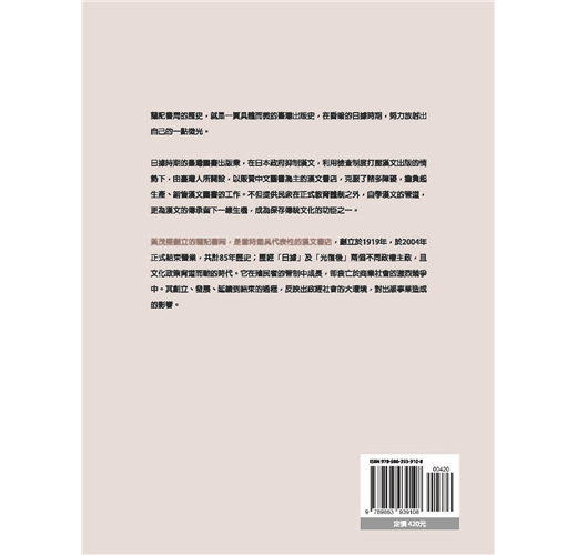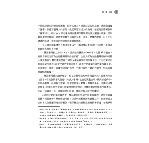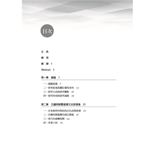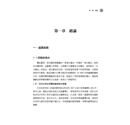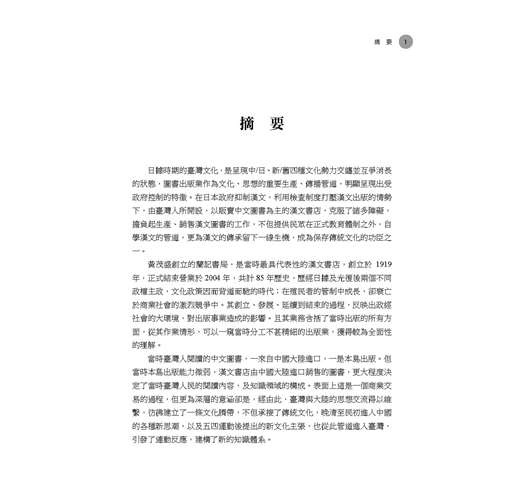 日據時期的臺灣圖書出版業,在日本政府抑制漢文,利用檢查制度打壓漢文出版的情勢下,由臺灣人所開設,以販賣中文圖書為主的漢文書店,克服了諸多障礙,擔負起生產、銷售漢文圖書的工作,不但提供民眾在正式教育體制之外,自學漢文的管道,更為漢文的傳承留下一線生機,成為保存傳統文化的功臣之一。
