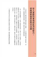 不需要大空間,在家一個人也能做的運動與小遊戲,跟著示範動作一步一步做,確實將氧氣和營養素傳遞到腦細胞,就能使大腦積極活用,除了運動飲食也是預防失智的關鍵,醋、納豆與富含DHA的魚類……等,並確實掌握咀嚼力,就能有效提升大腦機能。