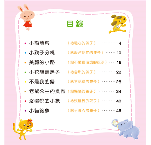 1. 針對孩子沒禮貌、不專心、不認錯……等行為,編寫八篇豐富有趣的故事,讓孩子邊聽故事邊學習。2. 故事內容淺顯易懂,貼近日常生活,幫助孩子理解寓意,並改正容易犯的小缺點。3. 角色造型可愛、色彩活潑多變,吸引孩子注意力,提升閱讀興趣。4. 故事CD發音清晰,敘述生動活潑,孩子可依語氣和對話,想像人物的情緒和故事情節,越聽越著迷。5. 適合親子共讀,和孩子一起說故事,共享溫馨的親子時光。