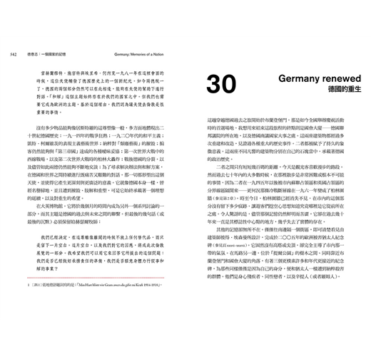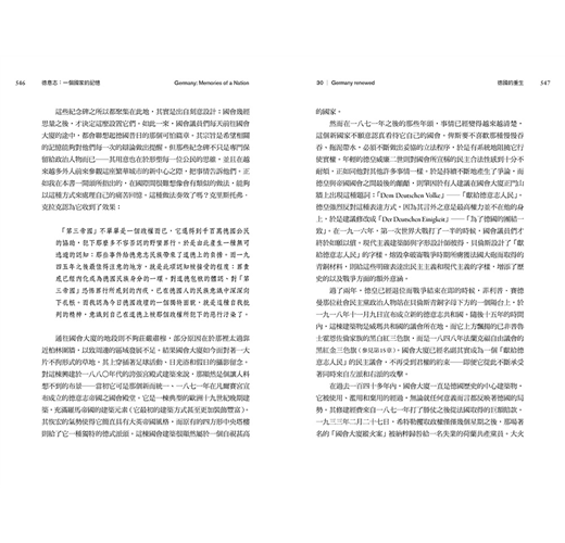 瑞士人和奧地利人當然也共享了其中的許多記憶,不過本書所探討的是二十五年前應運而生的那個德國,以及今日生活在那裡的人們的記憶。瑞士很早便開始在政治上脫離了德國的其餘部分;它在上個世紀的兩次世界大戰期間保持中立,更使得它具有一種極不相同的過去。奧地利的故事固然更緊密地與鄰居德國的故事交織在一起,在許多關鍵因素方面卻有所不同。奧地利不曾遭到宗教改革永遠的撕裂;它針對拿破崙入侵所做出的反應並非強調民族獨特性,反而是努力鞏固哈布斯堡家族歷代祖傳的領地;況且它未曾經歷過冷戰時代的國家長期分裂,以及從此在德國的故事中所發生的一切,尤其奧地利沒有像現代德國那般痛定思痛,嚴厲而真誠地公開檢討自己在納粹帝國時代的記憶與責任。一本同時也涵蓋了奧地利記憶的書籍,將會變得非常不一樣。
