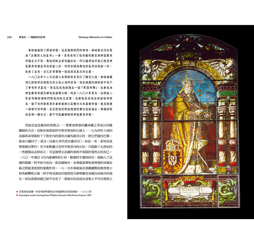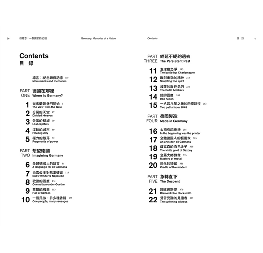 德國的歷史是如此支離破碎,因而不可避免地既多彩多姿又令人困惑。儘管人們對共同歸屬的大家庭有著強烈的意識,可是直到德國在一八七一年獲得統一為止,對共同的目標卻只有過一種閃爍不定的感覺。但即便如此,德國人的作為與經歷仍然大量帶來了廣泛共享的記憶:本書的目的便在於喚起其中的一些,並且對之進行探討。但本書並不打算(同時也不可能)在任何意義上成為一部關於德國歷史的著作,而是嘗試藉由各種物品、建築、人物和地點,來探究一些建構了現代德國民族身分的因素。時間最早的探究對象是來自一四五○年代的《古騰堡聖經》,那或許是德國對世界歷史進程發揮決定性影響的第一個時刻──事實上,那更為所有的現代歐洲文化奠定了重要基礎。為時最晚的探究對象則是最近被整修得煥然一新的「Reichstag」──德國國會大廈。