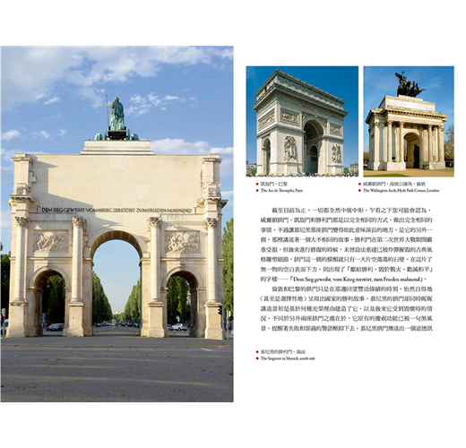 自從十九世紀中葉以來,前往巴黎、倫敦和慕尼黑的訪客,分別會在各市內受到凱旋門的迎接。這些凱旋門都具有壯麗的古羅馬風格,各自紀念本國於一七九二至一八一五年之間,在那些把歐洲攪得天翻地覆的戰爭中所獲得的勝利。英國人在「海德公園角」樹立起威靈頓拱門,接著時隔將近一百年之後,又在其頂端放上了那尊巨大的四馬雙輪戰車銅像。它不只是矗立在當時倫敦市區的西部邊緣而已,甚至就位於滑鐵盧戰役勝利者威靈頓公爵自己的家門口。法國的凱旋門尺寸龐大、比例誇張,描繪著士兵出征的情景。它被設置在一條條星狀輻射出去的寬闊馬路之中心點,而其中三條馬路就是以拿破崙擊敗普魯士和奧地利的三場大勝仗來命名的。