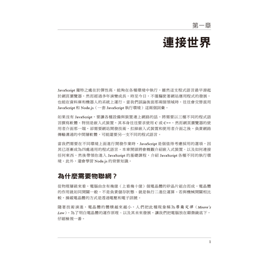 我們如何連結網路的虛擬世界與生活周遭的真實世界呢?原本JavaScript與Node.js屬於網站瀏覽器領域的技術,但是,若可以把存取嵌入式電子零件(感測器與微控制器)的功能、帶到JavaScript與Node.js的開發平台,說不定會對體感運算的世界造成翻天覆地的影響。本書屬於實務型指引手冊,針對硬體軟體工程師、創客、網頁開發人員所撰寫,探討如何在各種硬體平台上頭使用JavaScript程式語言,同時也會深入介紹微控制器、單板電腦,以及其他硬體元件。