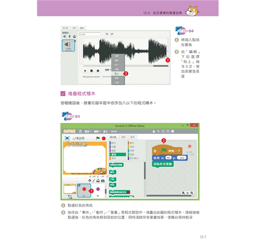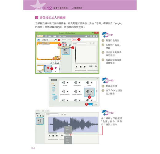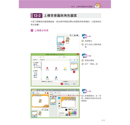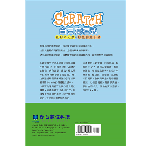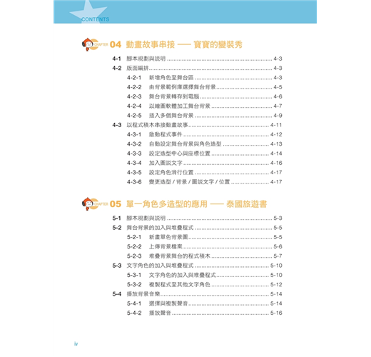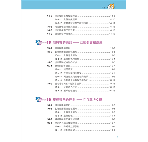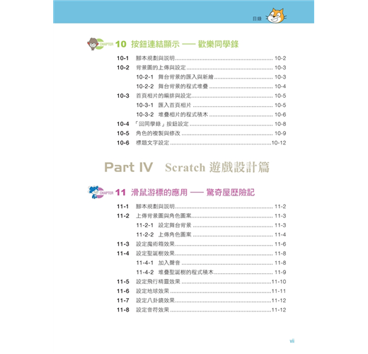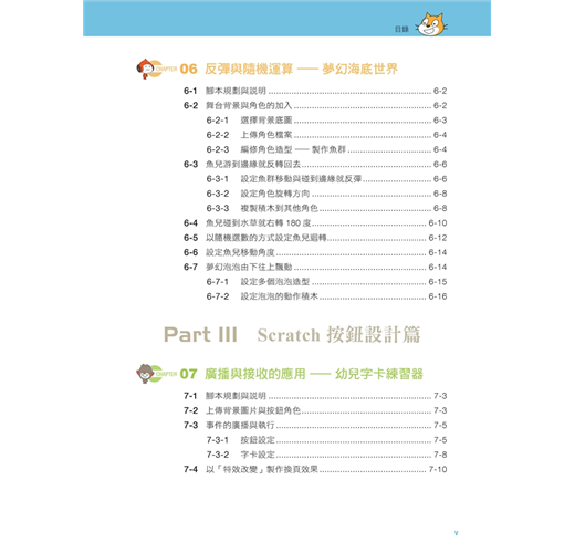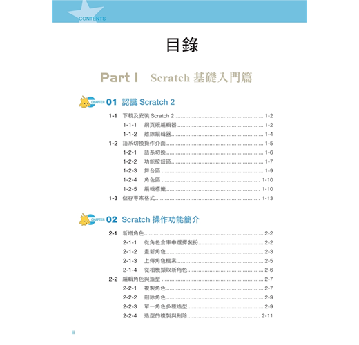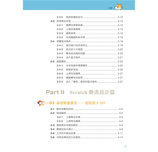 本書以Scratch 2.0版本為主,架構可分為基礎操作與範例實作兩大部分,前兩章針對Scratch的舞台、角色造型、音訊、程式積木的新增與編修做了完整的介紹,之後透過範例循序漸進的引導初學者活用Scratch的各種程式積木。