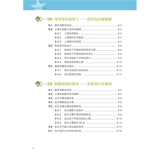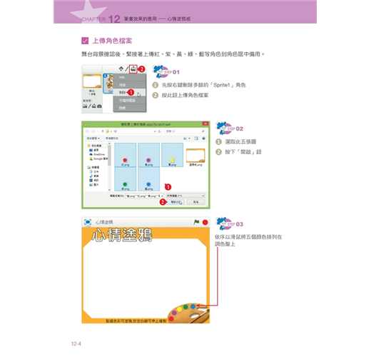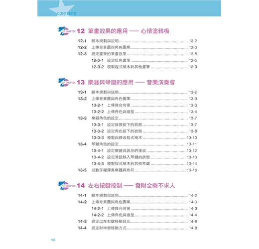*範例主題多元化,涵蓋動態賀卡、故事、動畫設計、按鈕設計、遊戲設計…等多種類型,讓學習者輕鬆學會各種程式積木的用法。
