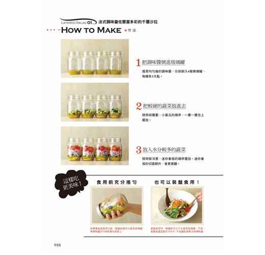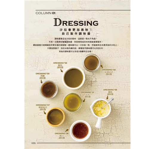 只要掌握訣竅,就不需要照菜單製作沙拉。請務必改變調味醬或蔬菜,或是改變配方,製作出全世界獨一無二的沙拉。