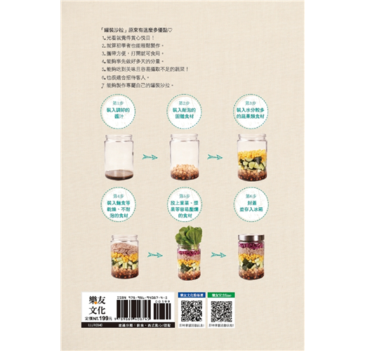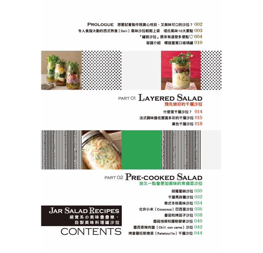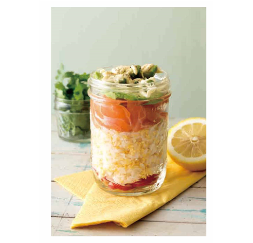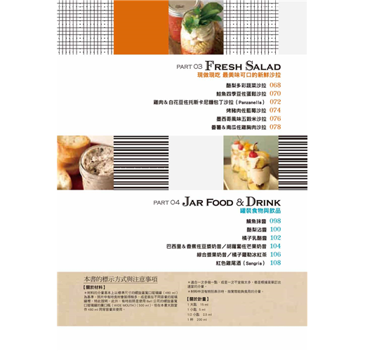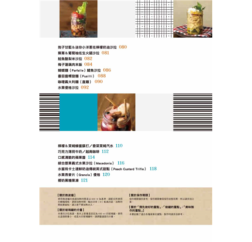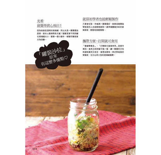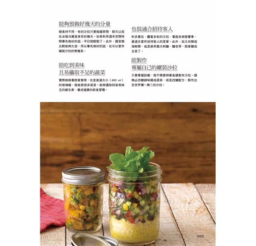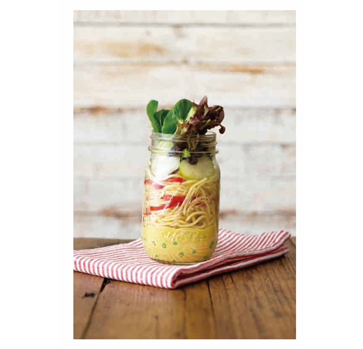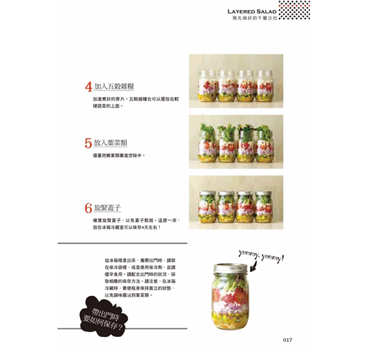 罐裝沙拉整罐帶著走,打開就可直接享用是當今潮流。食用之前把罐子搖一搖,讓一層層的沙拉和調味醬充分混合,會更加美味。西式熟食風的常備菜也可以用小型的玻璃罐攜帶。
