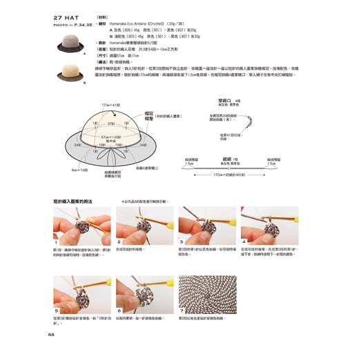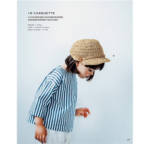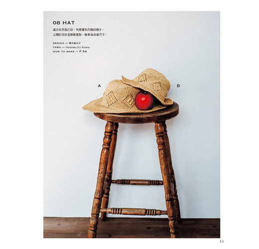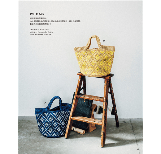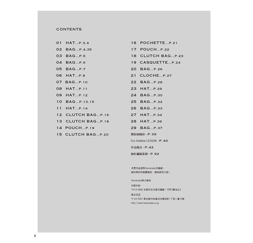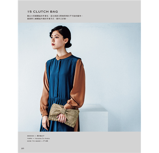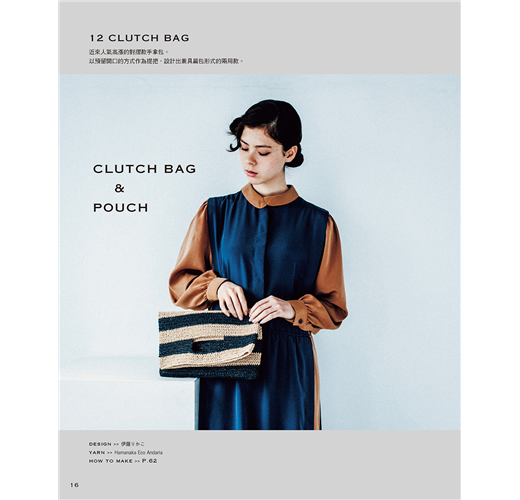 宛如流行櫥窗裡展示的29個設計款式,包含了各式帽子、手提包、肩背包、小零錢包,以及近年大人氣的手拿包。實際收錄的示範作品,更是以繽紛多元的配色和兒童款尺寸等,總計多達49項!大部分的作品都是使用最簡單的針法,只要依照詳細的編織圖和製作說明進行即可完成,即使是初學者也可以輕鬆享受鉤織的樂趣!
