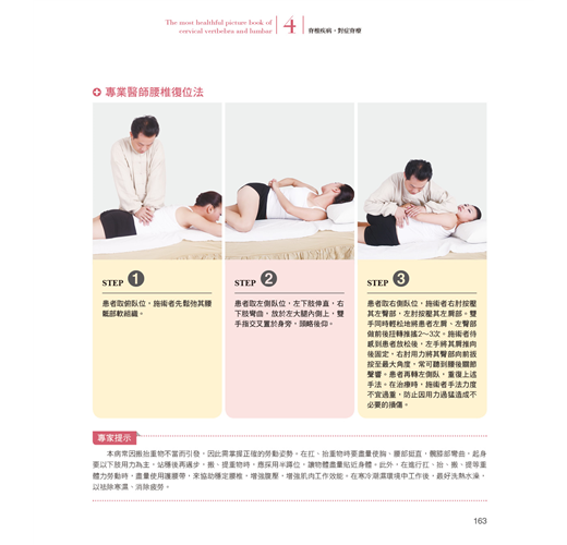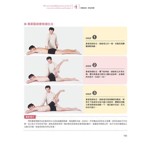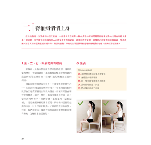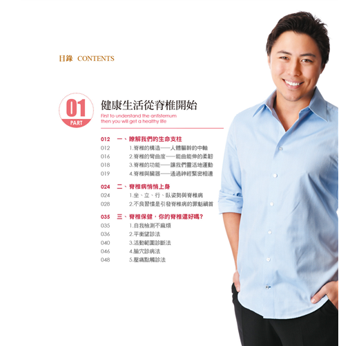 ●為了方便讀者學習,每一章內容中,都配有真人示範的實拍照片與解說圖,使讀者能方便的檢查脊椎隱患,調理脊椎病變。