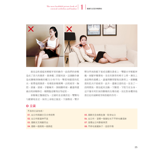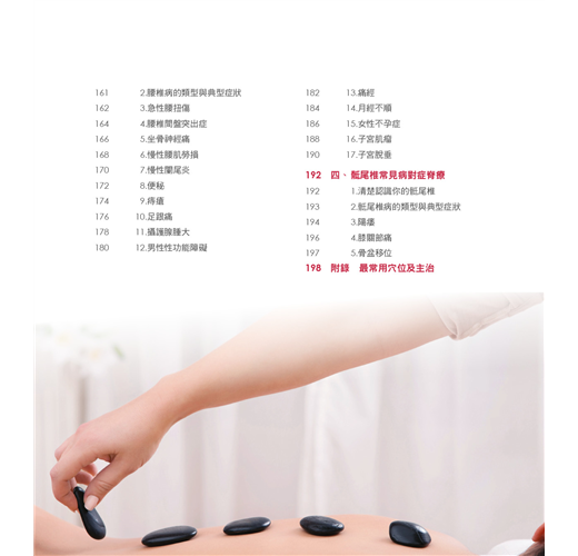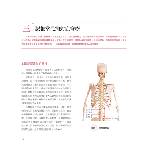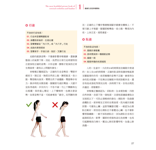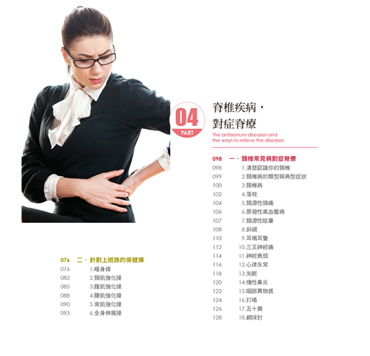 ●本書是一本家庭醫療專用的脊椎養護書,總共囊括了16 種頸椎病症、12 種胸椎病症、15 種腰椎病症、3 種尾椎病症全方位守護。