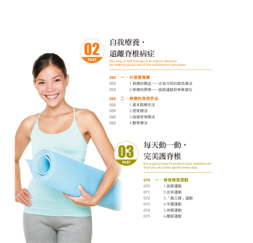 ●日常保健非常簡單!讓你自己在家就可以照著書上介紹的方法操作,方便、快捷地達到保健與治療的目的,永保身體棟樑──脊椎的健康。