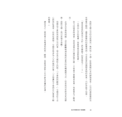 但在接手經營的同時,我也希望能給予老店新的生命,閱讀本書使我獲益良多,再次體悟老店的新生命源自於永續經營的概念,並需要整體的策略規畫搭配不斷地努力,才能維持成果。
