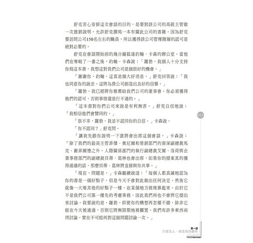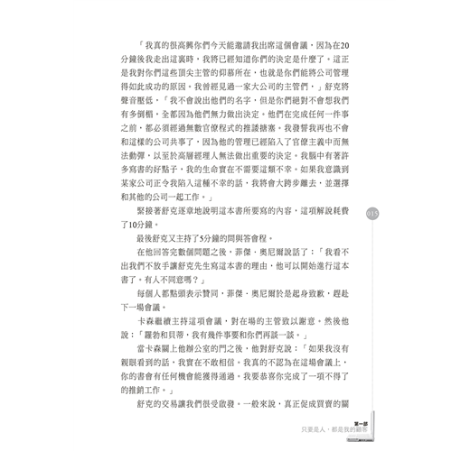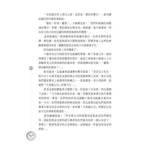 舒克繼續說道:「所有貴公司的重要決定都是由你們做出的,因此對我這本書的認可便成為你們最容易的一個小決定了。事實上,與那些真正的大決策相比,這無疑是一件最容易決定的事情。」