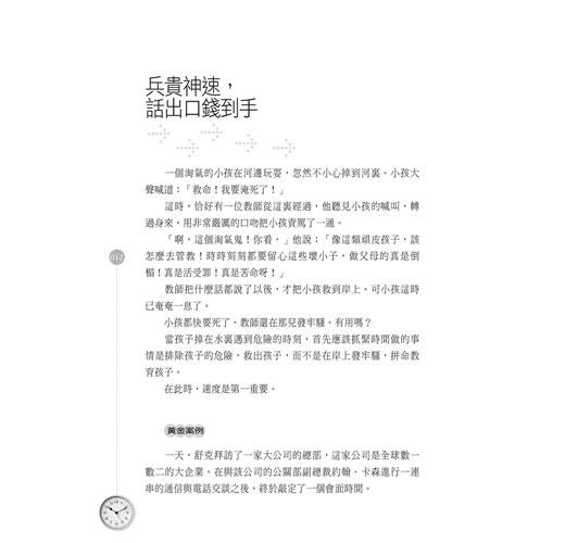 在推銷當中,速戰速決是成交最好的法則,作為推銷員你最重要的是把話說出去,把錢收回來,不能在中間停滯不前。