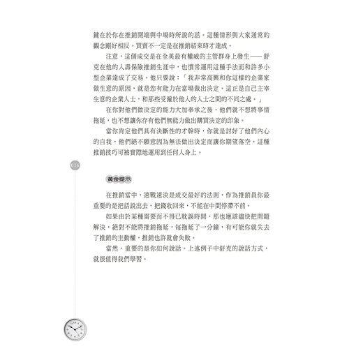 舒克的交易讓我們很受啟發。一般來說,真正促成買賣的關鍵在於你在推銷開端與中場時所說的話。這種情形與大家通常的觀念剛好相反。買賣不一定是在推銷結束時才達成。
