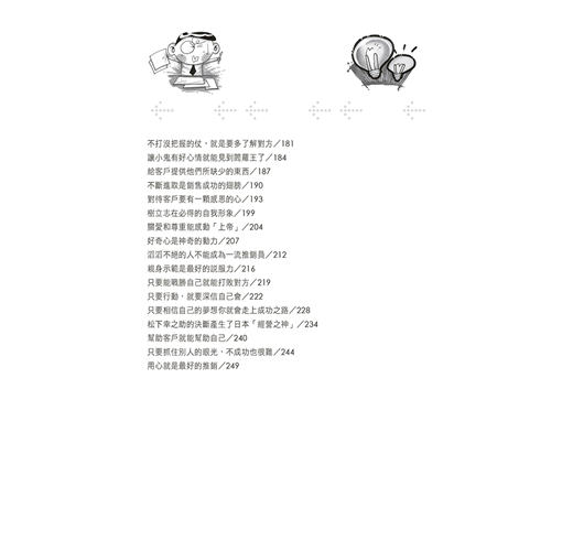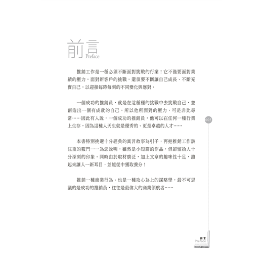 本書特別挑選十分經典的寓言故事為引子,再把推銷工作該注重的竅門一一為您說明,雖然是小短篇的作品,但卻留給人十分深刻的印象。同時由於取材廣泛,加上文章的趣味性十足,讀起來讓人一新耳目,並能從中獲取養分!