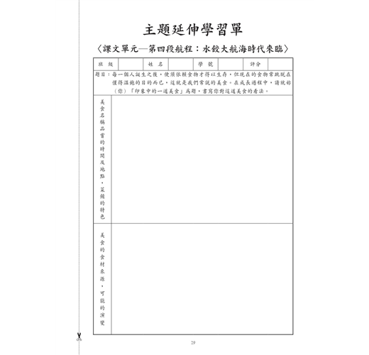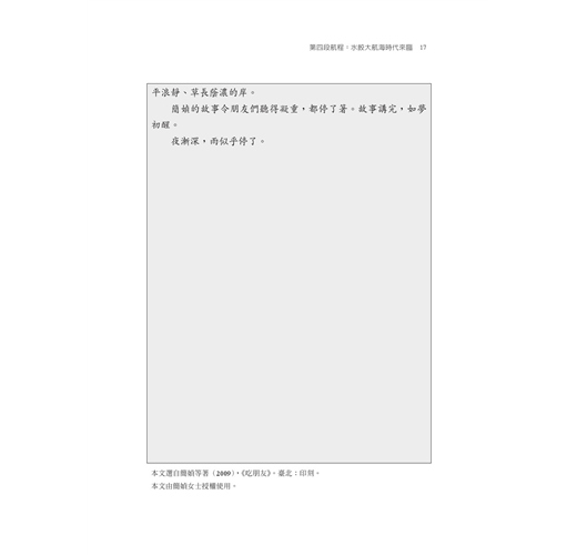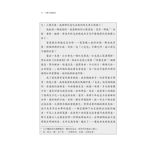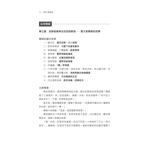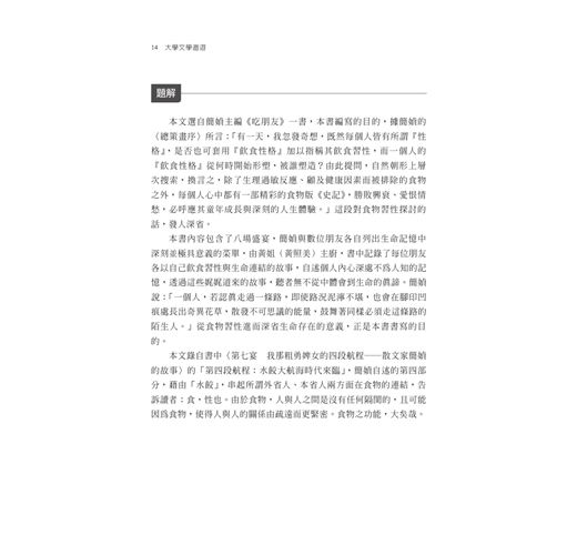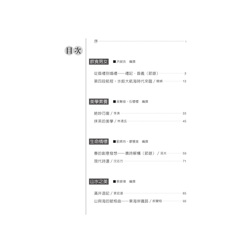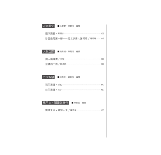 本書因應大學國文課程需要而編定,以語文知識的拓展、閱讀思考能力的強化、文書寫作的應用為目標,藉以增進學生中文表達與溝通的能力。本書內容涵蓋八大主題:飲食男女、美學素養、生命情懷、山水之美、人物風采、人我之際、古代智慧、閱讀與寫作,並透過每一單元「延伸學習單」的設計,引發學生思考、研究、討論、寫作與應用的興趣,增強師生的互動與語文表達能力的精進,強化學生自發性學習的能力。